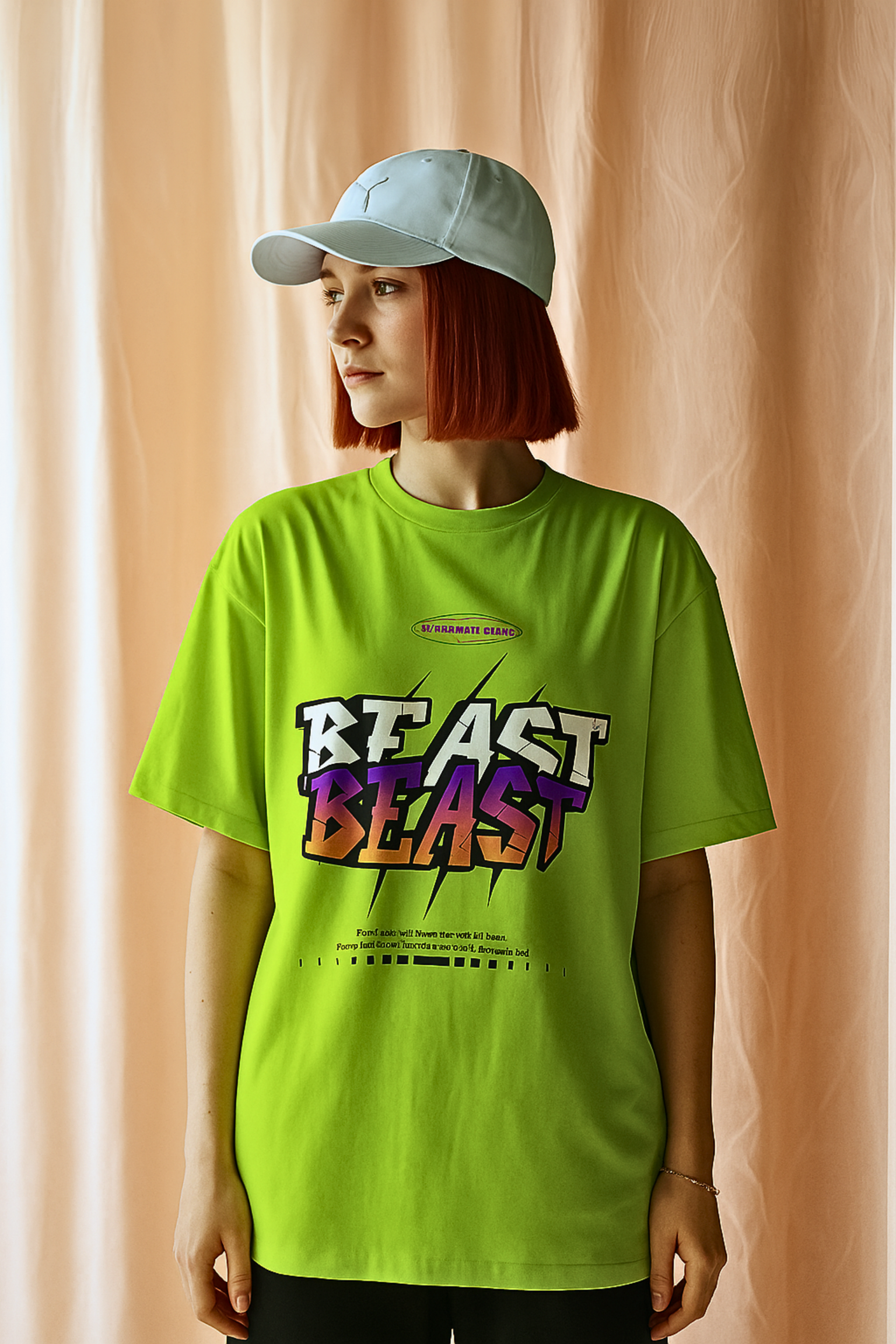 Unleash your bold side with the Neon Green Oversized “BEAST” Graphic T-Shirt. Designed for those who love to stand out, this vibrant lime-green tee features a striking dual-tone BEAST graphic in purple-to-orange gradient with streetwear-inspired lettering. Made from premium breathable cotton, it ensures all-day comfort while keeping your style loud and unapologetic. Perfect for casual outings, parties, or making a statement on the streets. Pair it with joggers, cargo pants, or shorts for the ultimate urban vibe.